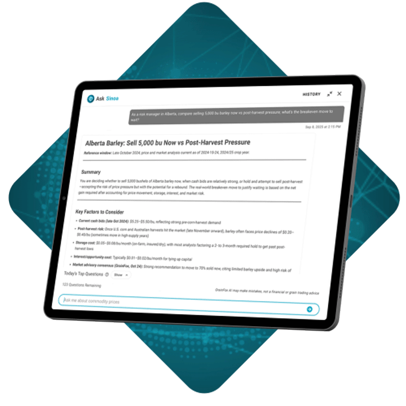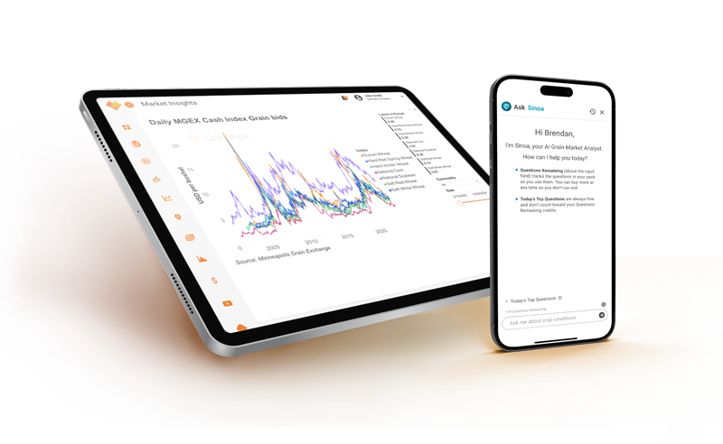 Getting market insights is as simple as asking a question – anytime, anywhere. Sinoa by GrainFox gives you instant clarity on grain markets, weather, crop conditions, and more — all backed by analyst expertise and real-time market signals. No waiting, no guesswork. Just straight answers you can trust.